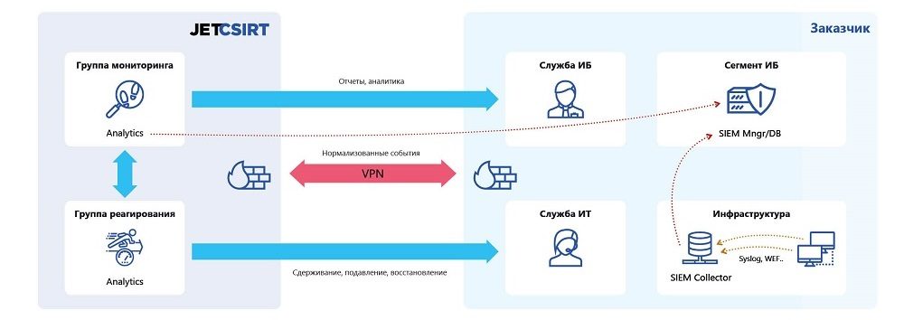 Jet CSIRT начинается с команды. Ее основу составляют группа мониторинга и группа реагирования. Первая решает задачи сбора, нормализации, хранения событий, корреляции инцидентов, управления уязвимостями и аналитики. Вторая отвечает за ограничение и нейтрализацию угроз, восстановление инфраструктуры, экспертизу ИБ, консультирование, администрирование СЗИ и т.д.