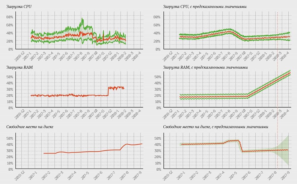 Сведения из разнообразных систем мониторинга, хранящих историю состояний технических средств, дают возможность строить тренды с прогнозом развития ситуации с высокой степенью достоверности. Система дает ответ по каждой машине, — например, что будет с загрузкой центрального процессора: она будет расти, падать или останется неизменной в течение трех месяцев, полугода, года?