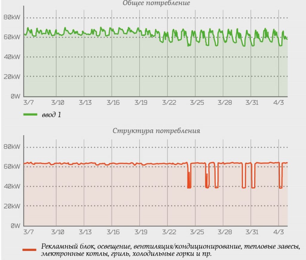 1. Общий уровень экономии электроэнергии составил 25%. Экономия затрат на электроэнергию за первые 2 недели работы решения превысила 30 тыс. руб. Она достигнута за счет автоматизации управления инженерными системами (отопление, тепловые завесы, внешнее освещение, освещение холодильных горок и т.п.):